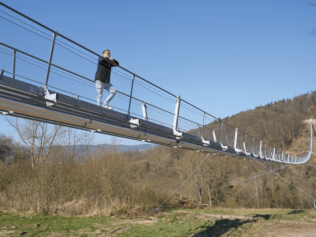 Allerdings war es von der Idee bis zur Eröffnung ein langer Weg: Inspiriert von der Fußgängerseilbrücke „highline179“ im tirolerischen Reutte entstand bereits 2016 der Wunsch, eine Brücke in der Mitte Deutschlands zu verwirklichen. Im Jahr 2017 startete die Planungsphase. Es folgte eine langwierige Suche nach geeigneten Experten. Die Wahl fiel schließlich auf ein Schweizer Unternehmen, das sich jedoch erst mit den deutschen Gegebenheiten vertraut machen musste. „Wir haben unzählige Gespräche mit den Kommunen, dem Bauamt und der Naturschutzbehörde geführt – für alle war solch ein Projekt völlig neu“, erinnert sich Stuhldreher. Die Genehmigungsphase zog sich in die Länge, auch weil aufwendige Gutachten zur Umweltverträglichkeit notwendig waren.
