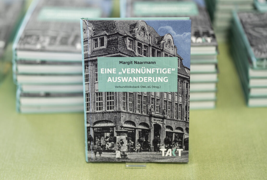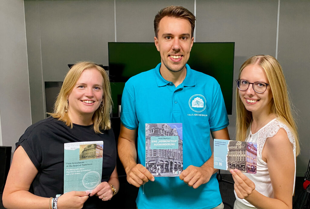 Aber auch ein „traditionelles“ Medium wurde eingesetzt: Das Buch „Eine ‚vernünftige‘ Auswanderung“ von Dr. Margit Naarmann wurde im Kontext der Ausstellung von der VerbundVolksbank OWL als Neuauflage herausgegeben. Es beschäftigt sich mit der Historie des Hauses und der bewegten Geschichte der Familie Grünebaum. Das Buch ist im Paderborner Buchhandel und online für 20 Euro erhältlich.