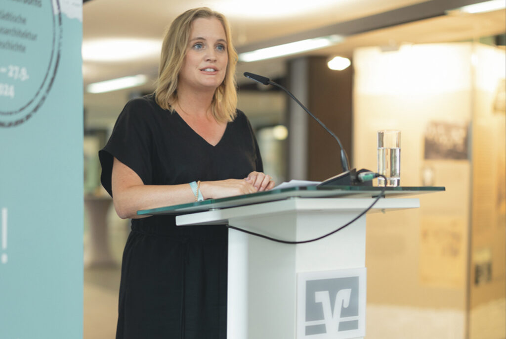 Der 25. Juli 2024 war ein Tag voller Emotionen und ein historischer Moment, der in die Paderborner Stadtgeschichte eingeht: Die offizielle Umbenennung des ehemaligen Kaufhauses „Steinberg & Grünebaum“ in „Haus Grünebaum“ war für alle Beteiligten deutlich mehr als das Enthüllen einer Gedenktafel. Vor allem die Anwesenheit von rund 30 Nachfahren der Familie Grünebaum, die für die Umbenennung des Hauses und die Eröffnung einer begleitenden Ausstellung aus Israel und den USA angereist waren, sorgte für emotionale Momente. Diese Ausstellung, die im BeratungsCenter am Neuen Platz eröffnet wurde, trug den Titel „Das Haus Grünebaum im Herzen Paderborns – Großstädtische Warenhausarchitektur mit Geschichte“. Sie wurde von Heike Sondermann-Salzig, die die Kunst- und Kultursammlung der Bank betreut, in enger Zusammenarbeit mit dem Stadt- und Kreisarchiv Paderborn konzipiert.