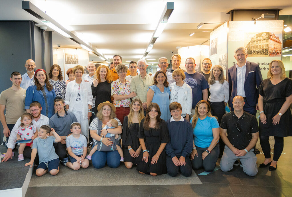 30 Nachfahren der Familie Grünebaum kamen in Paderborn zu einem großen Familientreffen zusammen. Gemeinsam mit Heike Sondermann-Salzig und Ansgar Käter teilen sie die Freude über die Aufarbeitung der Geschichte rund um das Haus Grünebaum.
